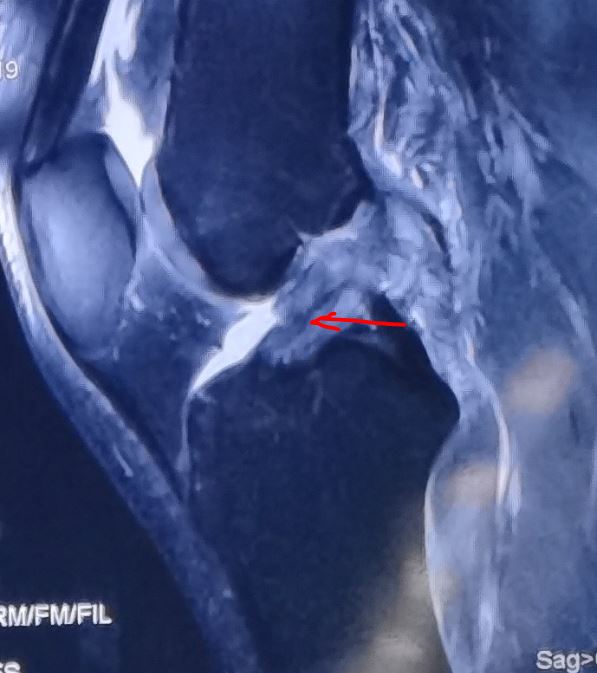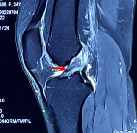 膝关节扭伤后可以通过核磁MRI清晰显示前交叉韧带损伤,但韧带残端可见