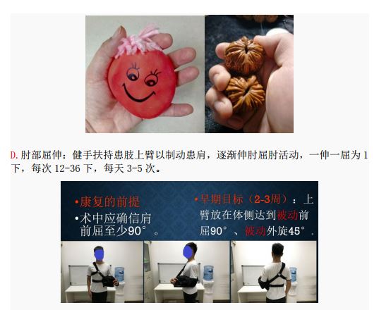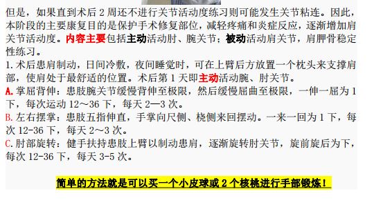 * 肩袖缝合术后6—8周内被动练习肩关节角度,支具保护肩关节,锻炼时候拆卸支具,争取尽量恢复角度(外展、爬墙前屈、外旋摸对侧耳朵、内旋背手摸背),不要主动发力;术后3个月后开始肩关节主动发力,用小哑铃进行肩关节周围肌肉练习!