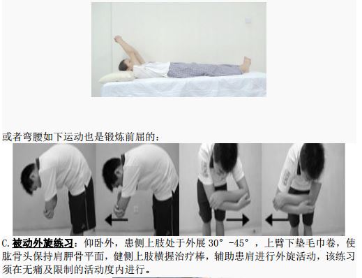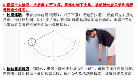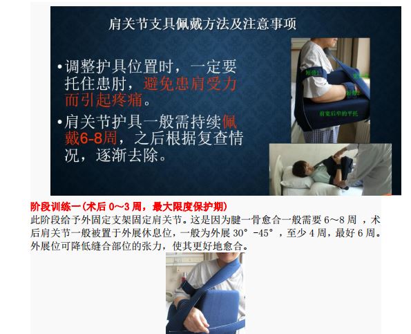 3,术后6-8周内被动活动角度,肩关节活动度大,只要被动活动就可,尽快恢复各个角度的活动范围,前屈、外展、外旋、背手。一般术后12周开始肩关节肌力练习,循序渐进增加,半年后才能逐渐从事体育或体力活动。