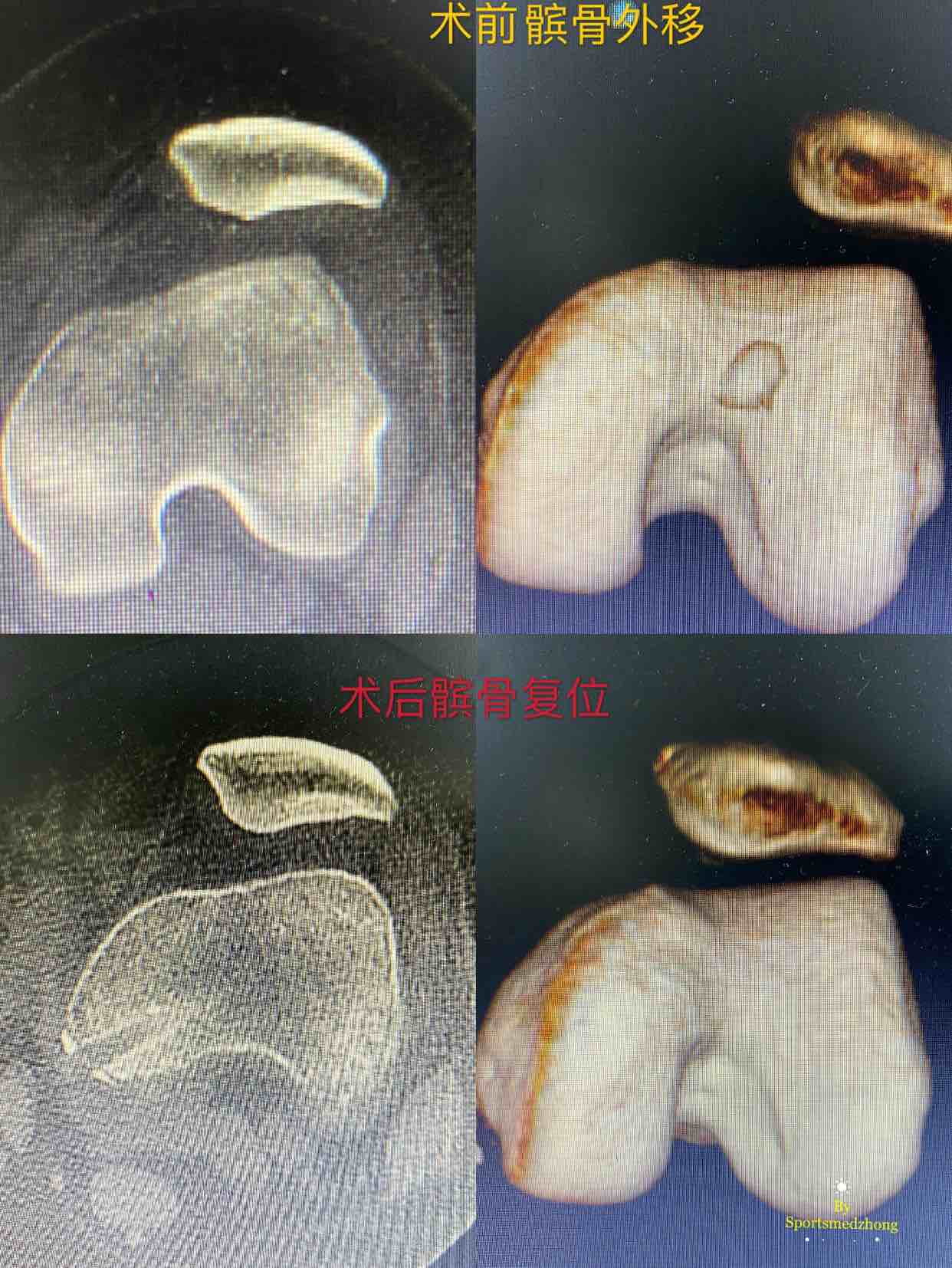 髌骨脱位造成髌骨内下极骨软骨骨折 需要CT检查 可以看见关节内游离骨片 (这是绝对需要早期手术的!)