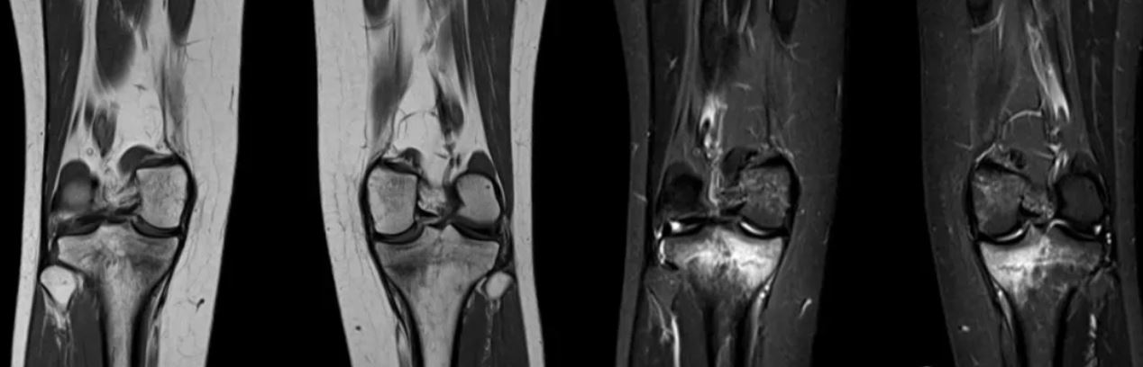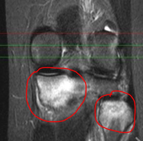 女,20岁,长期没有活动的情况,猛烈地参加一次长跑运动后 ,主诉出现双侧内侧胫骨疼痛。在双侧胫骨中,内侧近端应力性骨折是明显的。用手指一按压膝关节内侧平台明显压痛! MRI提示双膝关节内侧胫骨平台骨水肿(骨挫伤)