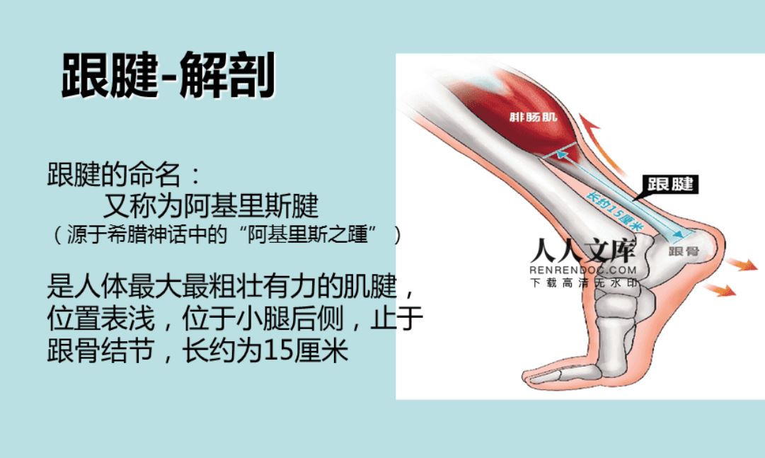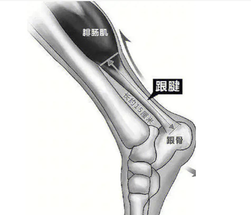 跟腱位于脚背后部,由腓肠肌和跟腱腓肠肌组成,起到使足部向下弯曲和脚背屈曲的作用。跟腱长约15厘米,直径约1.5厘米,是人体最大、最强的肌腱之一,承受着人体每一次的跳跃、奔跑和走路等活动。