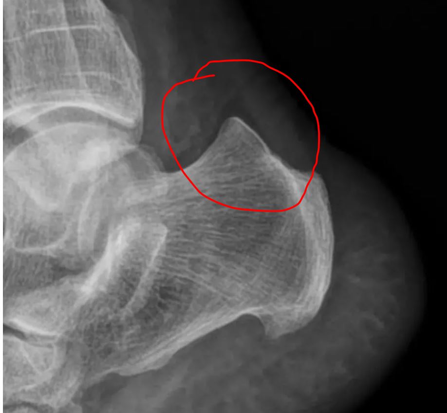 还有一种跟骨形态畸形:Haglund综合征—Haglund病是指跟骨后上部异常突起,跟骨后上方和跟腱之间的滑囊在反复的机械撞击下产生的炎性症状。 这种情况下保守治疗无效也应该手术治疗,磨除骨刺。