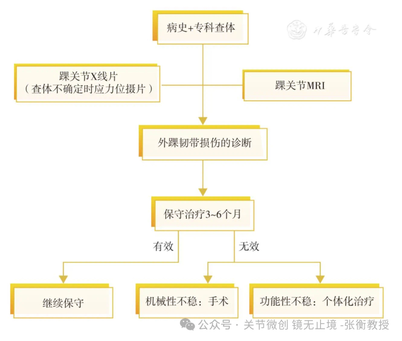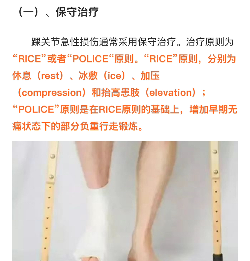 答: 目前主流原则还是遵循RICE原则,主要是休息冷敷(间断冷敷5-7天,每次10分钟,一天4-6次),局部加压包扎,石膏或踝关节支具固定4-6周最重要(韧带有自愈修复可能),后期功能锻炼(固定拆除后开始锻炼:踝关节角度恢复、踝关节周围肌力及本体感觉),目的是避免再次扭伤(踝关节不稳)。(本文最后,训练以循序渐进,逐渐进阶!)