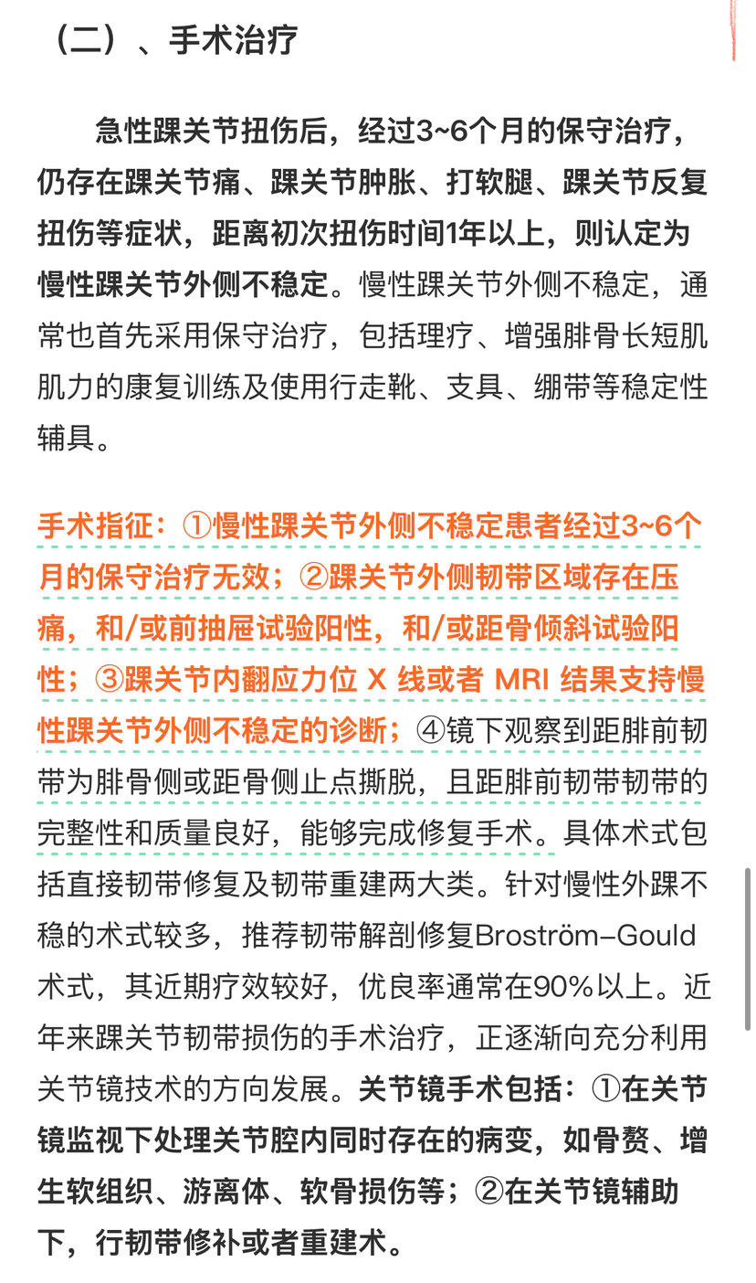 答: 保守失败者,存在疼痛、不稳或继发关节内损伤如软骨等存在临床症状,影响活动及运动,可以考虑手术(具体手术方案因人而异!)。