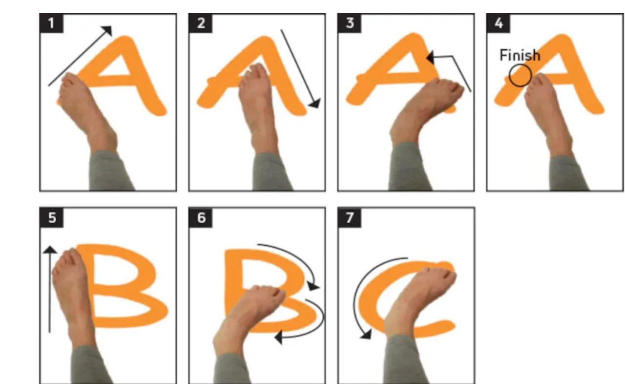 4,足踝写字(Alphabet):用脚写英语字母表中的字母。重复此操作两次。