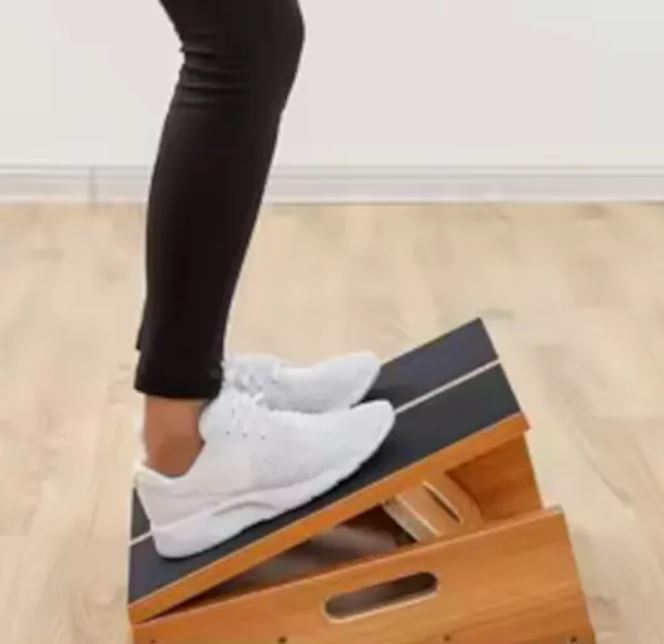 5,斜板拉伸(Slant Board Stretch):脚跟平放在斜板上站立,身体前倾,膝盖弯曲。你应该感到有拉伸感。保持至少20秒并重复3次。