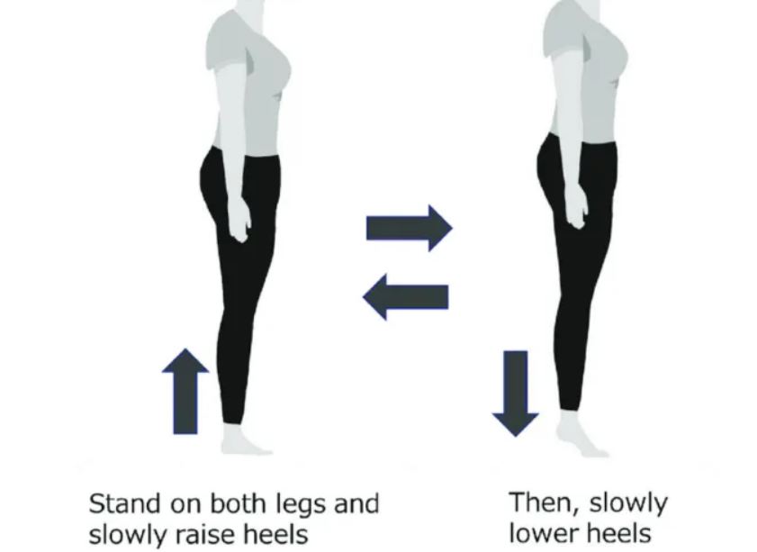 8,提跟点脚(Calf Raises):首先双脚站立,用椅子或桌子稳定自己。双脚足跟抬起,脚趾点地,保持 3 到 5 秒,然后慢慢放下。执行 3 组,每组 10 次。当它变得更容易时,切换到单腿提踵。