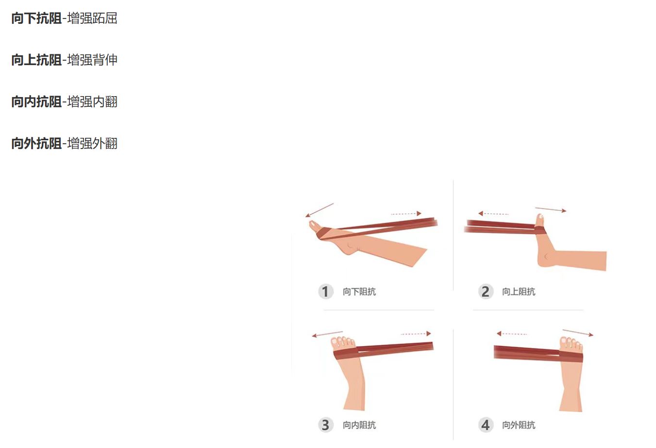 7,治疗带运动(Theraband Movements):如果可能的话,在腿下放一条卷起的毛巾或泡面滚筒。将带子固定在门或桌腿上。将脚趾拉向脸部(背屈)、向下推(跖屈)、向内转动(内翻)和向外转动(外翻)。每个动作重复此动作 10 次。完整循环 3 次。
