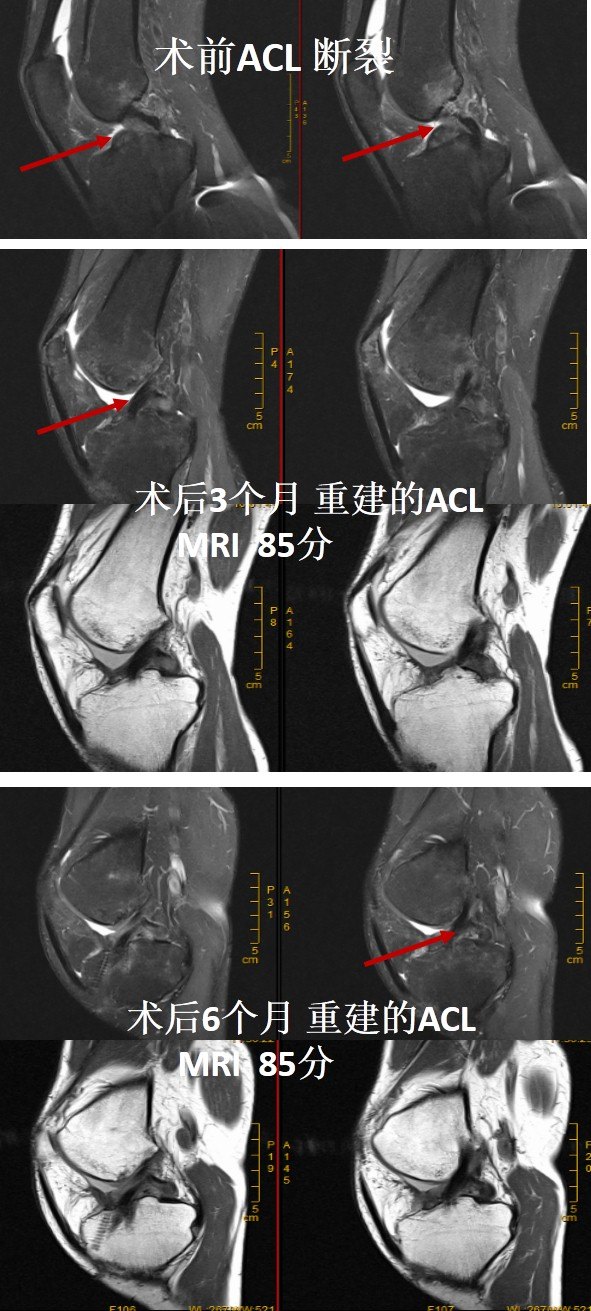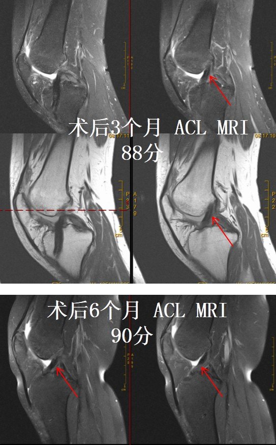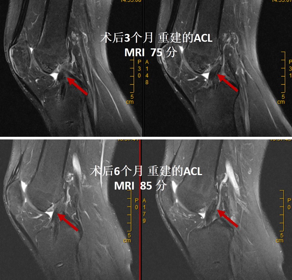 ACL重建后进行MRI评估是评估重建ACL塑形的最直观的非创伤性检查方法。我们的观点认为,如果重建的ACL在MRI上的评分在80分以上(MRI的三个评估指标,总分90分:韧带的容积-30分;韧带的张力-30分;韧带的灰度-30分),术后膝关节功能就恢复好,再次恢复到伤前运动状态的几率就大,重建韧带发生再断裂的风险就低。而且我们在随访过程能根据重建的ACL在MRI上的评分结果调整康复进程,指导患者的运动方法,以利于重建韧带的最终塑形,这个十分重要的。