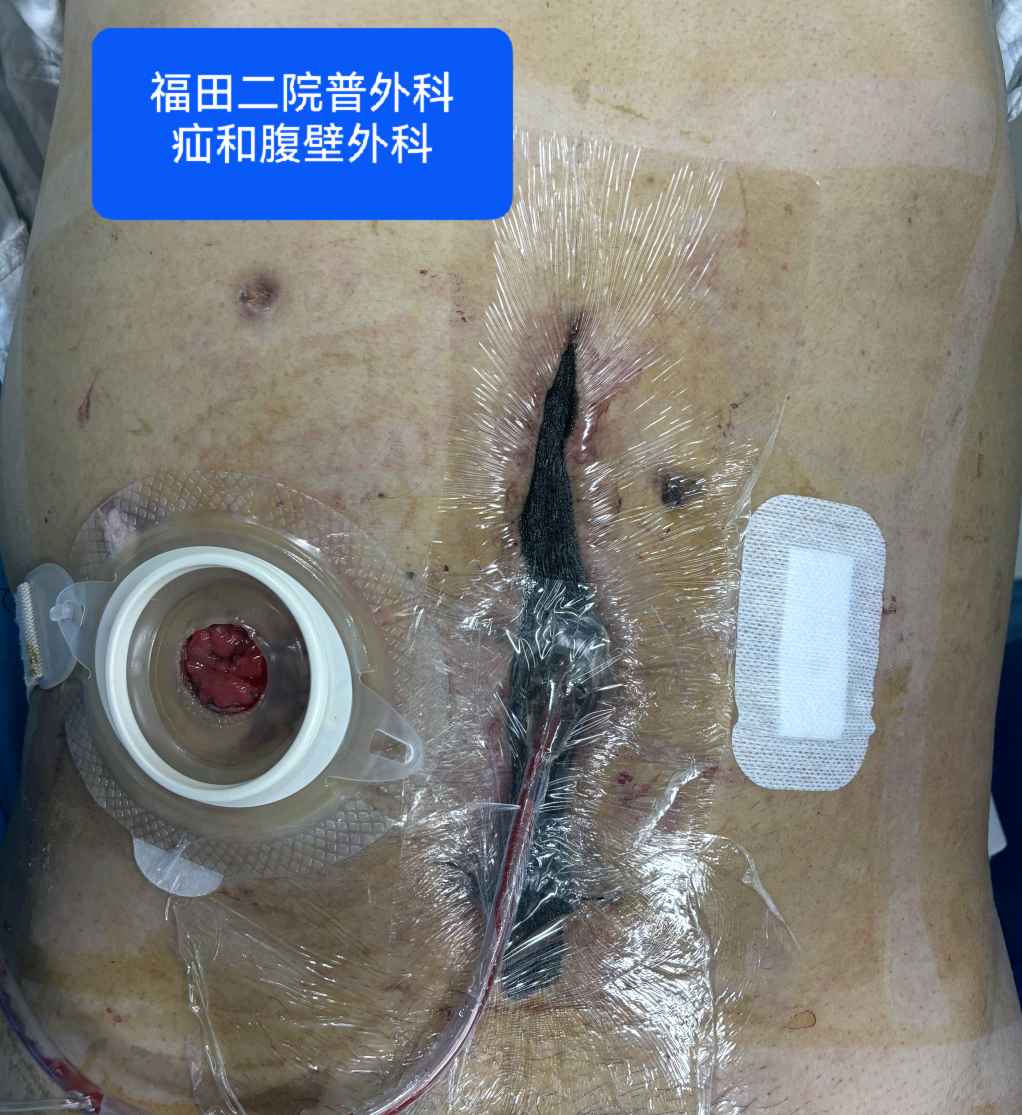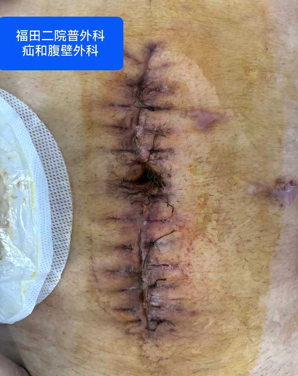 男,31岁,在某医院行肠道手术(有回肠造瘘)术后,出现切口感染前来我院治疗。