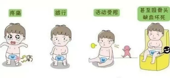 宝宝翻身、爬、走、跑、跳等都和髋关节密不可分,如果在早期筛查时错过矫正期或未给予治疗,可导致疼痛、跛行、摇摆步态、腰前凸增加、过早出现骨性关节炎,甚至成年早期需进行全髋关节置换术。