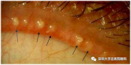 睑缘充血,睑板腺口隆起、脂栓