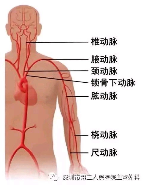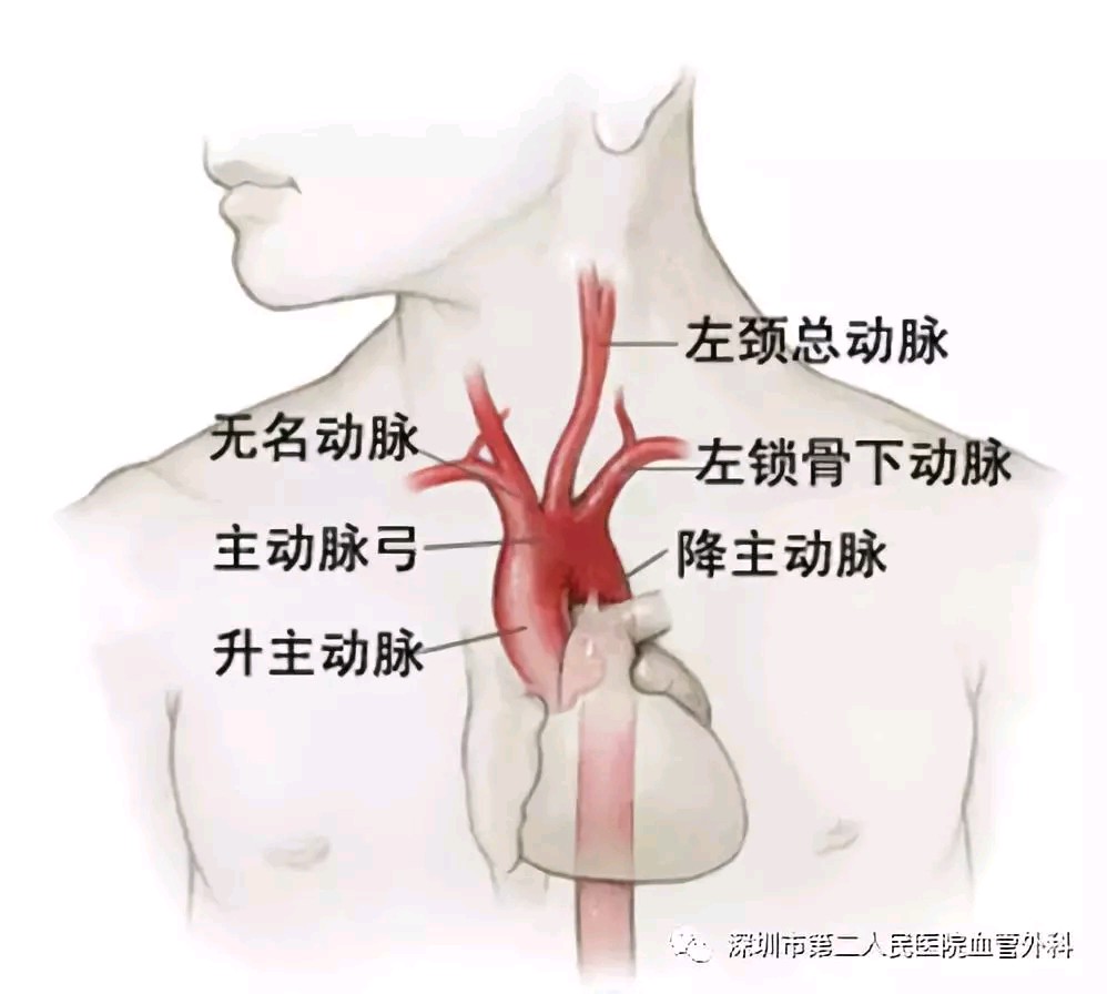 主动脉弓从右向左依次向上发出无名动脉、左颈总动脉、左锁骨下动脉三根分支动脉,俗称“三根毛”。