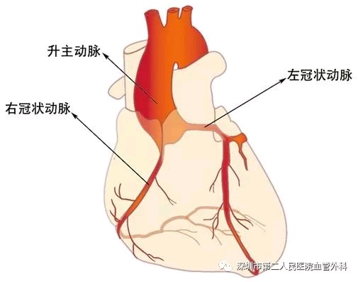 动脉血出心脏后流经的第一段大血管便是升主动脉(图2)。因为走向是朝上的,故得“升”名。升主动脉段是距离心脏最近的血管,因而承受的血压最大,血管管腔也最粗。它的根部发出两支较小的血管,你可千万别小瞧这两支小血管,它们就是大名鼎鼎的冠状动脉(图3)。前面我们已经知道,心脏是血液循环的“泵”和“发动机”,心脏的收缩是血液前行的动力。心脏与全身其他组织器官一样,也需要补充氧气养分、排除代谢废物,这靠的就是冠状动脉。