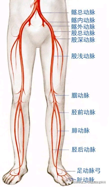 此时的血管直径已从刚出心脏时的2-3厘米(升主动脉)缩窄为不足1厘米。尽管已明显“瘦身”,但股总动脉仍忠实的执行着向下肢输送“补给”的作用,它在大腿根部分为股深动脉和股浅动脉两部分,股深动脉主要负责向大腿组织供血,而股浅动脉则继续向下跋涉,到膝关节附近成为腘动脉,再到小腿处分叉为胫前动脉、胫后动脉、腓动脉,直至足部的足背动脉、趾动脉等末梢动脉。