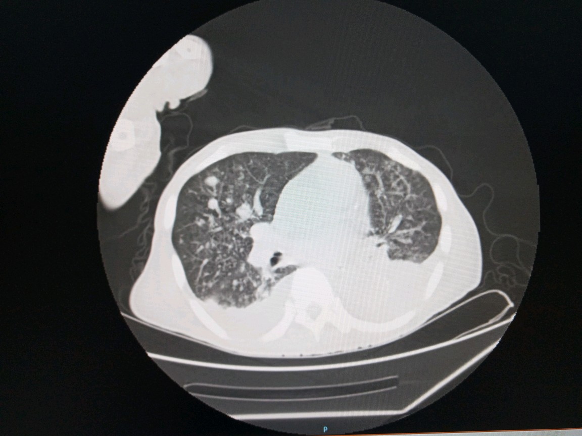 进一步完成胸部和腹部CT检查发现。不光是骨头有转移,肺上多发的转移瘤。右侧的肾上腺也有转移。