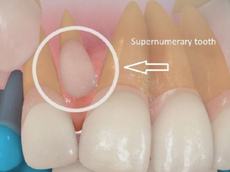 多生牙,又叫“额外牙”,是除了20颗乳牙、28-32颗恒牙以外,再多长出来的牙齿。大多数多生牙的形状与正常牙不同,临床上常见的是圆柱形或圆锥形。多生牙有的萌出牙龈外,有的埋伏在牙龈内,有的甚至出现倒长。