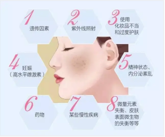 脸色暗沉长斑,就是我们常说的“黄褐斑”,是一种色素沉着性皮肤病,表现为颧部、面颊、额部乃至下颌部淡褐色或深褐色斑片,皮疹大小不一、形态不一、颜色亦不均一,春夏加重,秋冬减轻,无明显自觉症状,多发生于中青年女性,严重影响面部美观,降低社交自信心。黄褐斑产生的原因大多与日光晒照、情绪不良、内分泌紊乱、熬夜、饮食不规律、妊娠、遗传等因素相关。