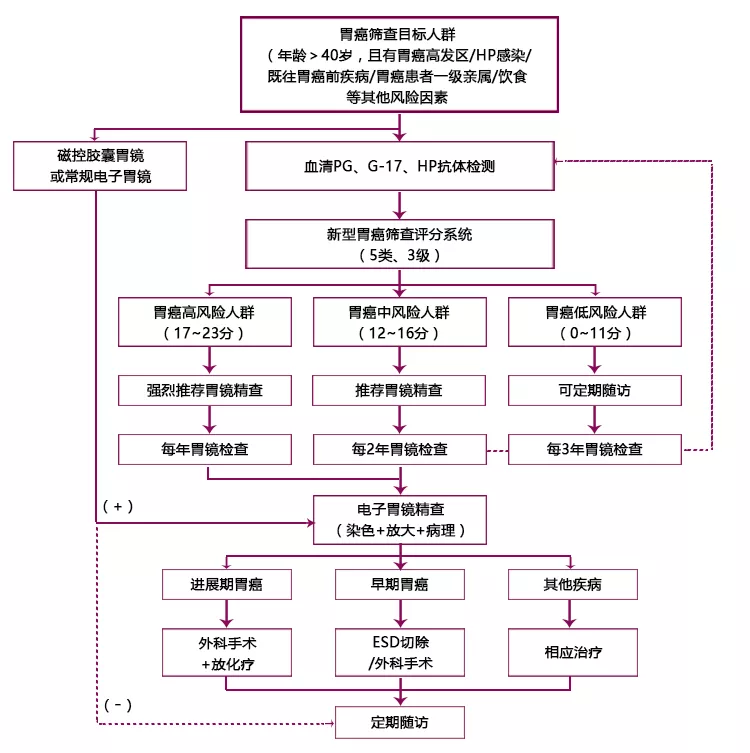 胃镜:高风险人群建议筛查项目。胃镜及其活检是目前诊断胃癌的金标准。但因“痛苦、昂贵、需要一定的技术设备“,不能进行大规模胃癌筛查。因此,首先采用非侵入性诊断方法筛选出胃癌高风险人群,继而进行有目的的内镜下精查是更为可行的筛查策略。
