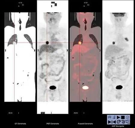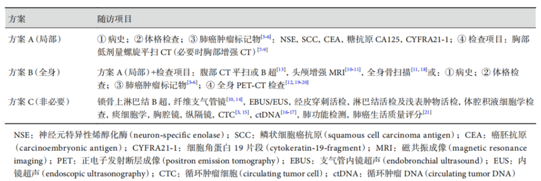 全身正电子发射断层成像(PET)检查在无症状复发病灶诊断上有较高的敏感度及特异性。当一些良性病变(如肺不张、肺实变和放射性纤维化)在标准CT影像中难以与肿瘤区分时,全身PET-CT或PET-MR可以区分真正的恶性肿瘤,因此可根据患者病情、意愿、经济能力等做出选择。