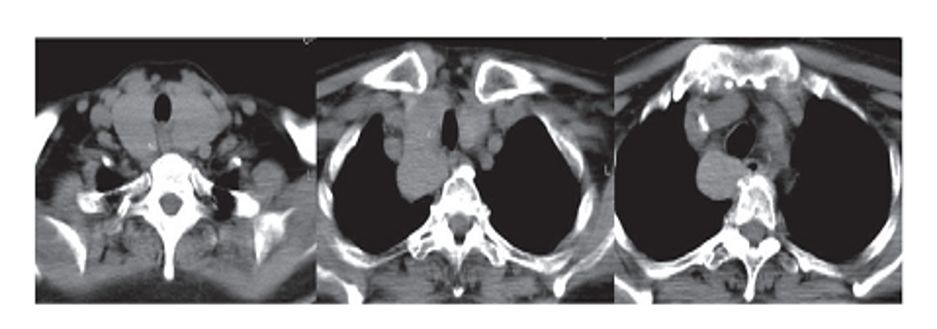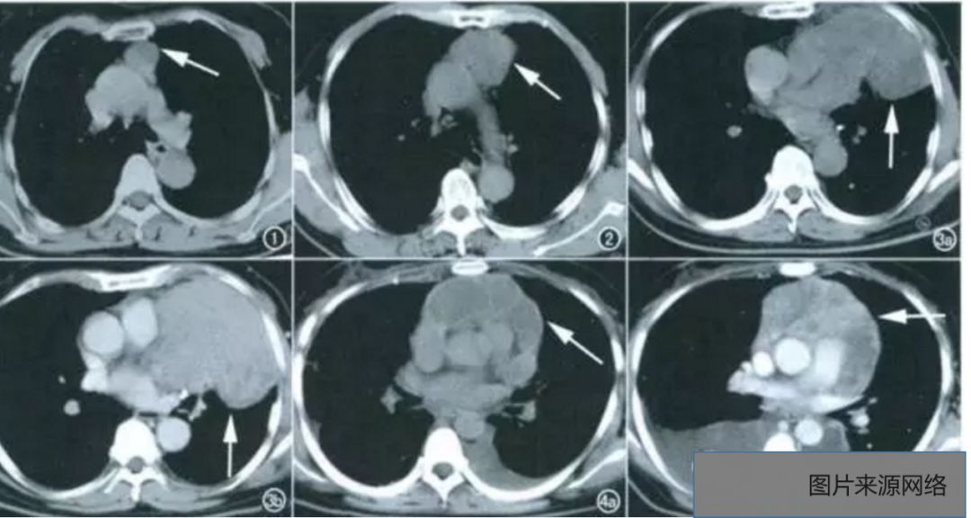 前纵隔上部多发,颈胸征;气管等周围结构受压移位;可随吞咽移动;平扫CT值较高,强化明显、时间长;可有钙化及囊变;可有内分泌异常症状。