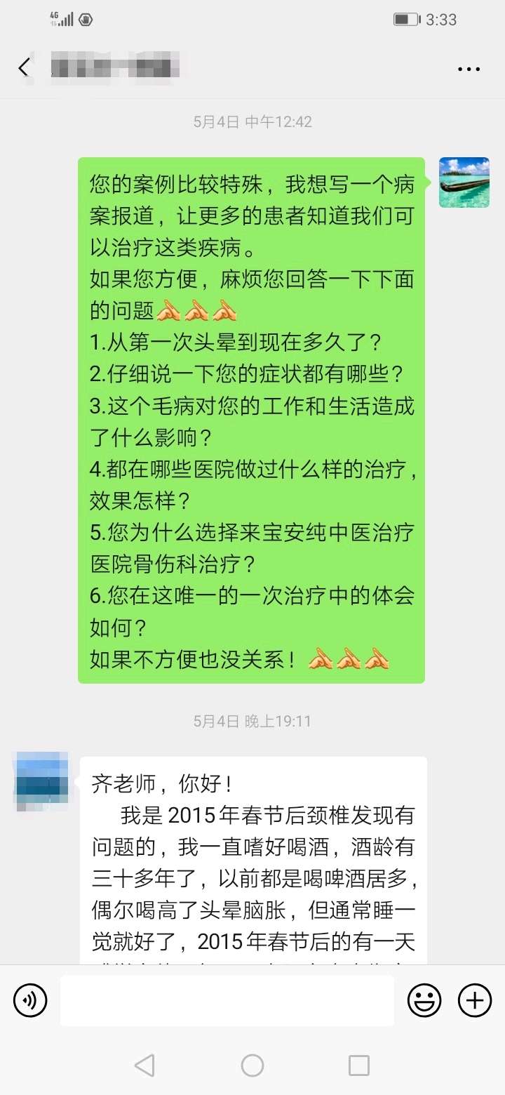 病史:5年前酒醉后出现颈部不适,伴头晕头痛,多科室就诊后,排除颅脑疾病,诊断为“颈椎病”。多方求治(具体不详)无效,经人推荐前来就诊。
