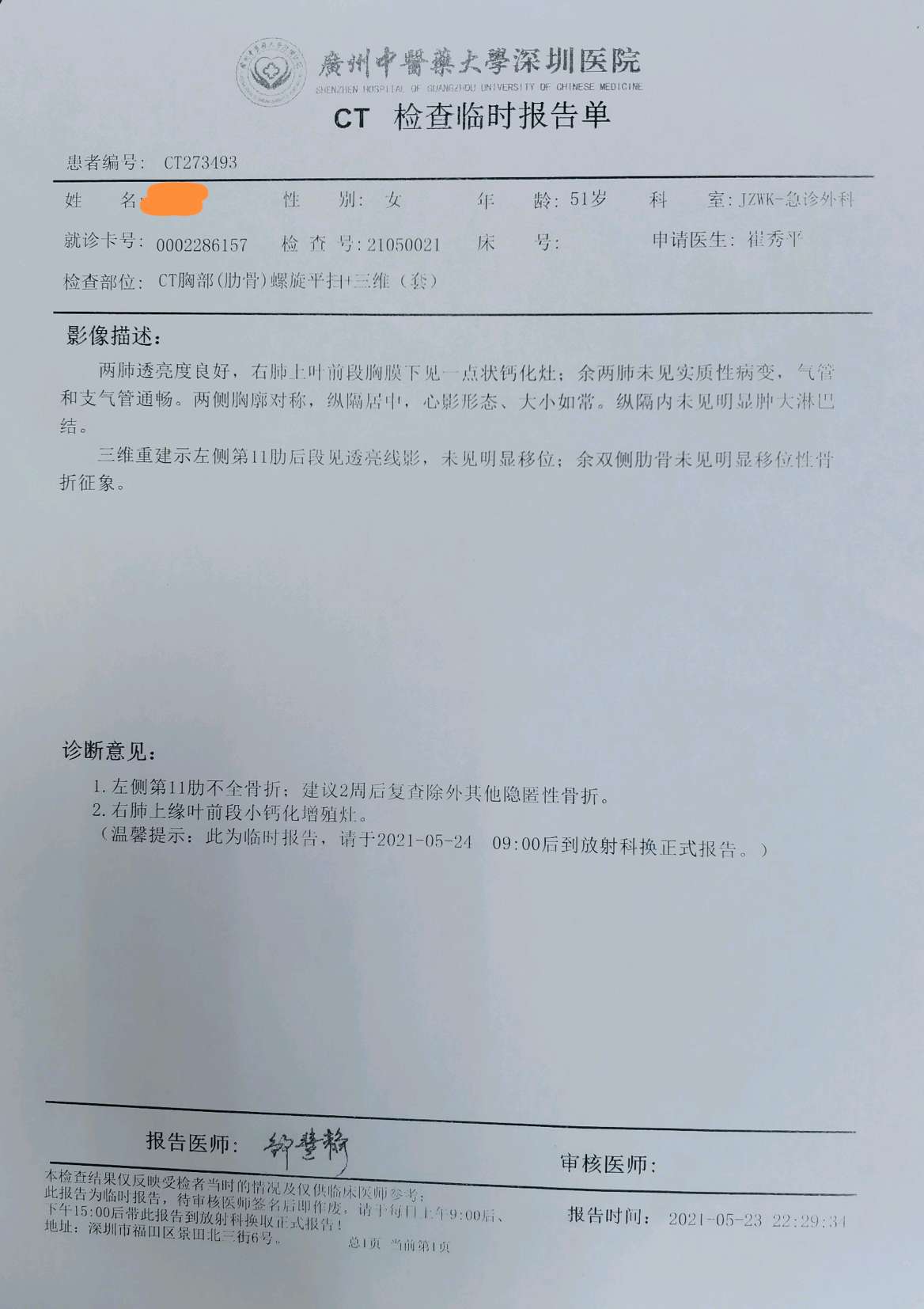 影像:自带三维CT片示:左侧第11肋不全骨折;不除外其他隐匿性骨折;右肺上缘叶前段小钙化增殖灶。
