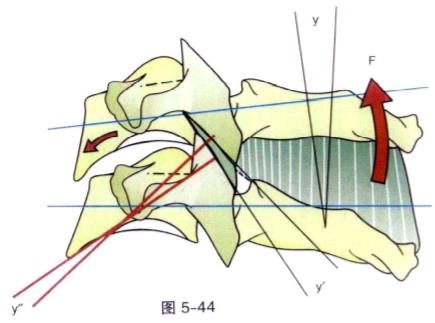 颈椎前屈时,上位椎体向前倾斜,滑动,压迫椎间盘前缘,把髓核推向后方。上位脊柱的前倾则 借助下位脊柱前缘的平坦区来完成。前屈时,上位脊柱的下关节面向前上方滑动,关节间隙 的后下方打开。
