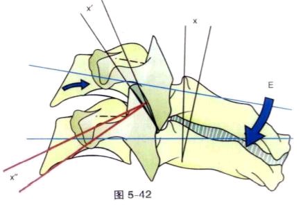 颈椎后伸时上位椎体向后倾斜与滑动,椎间隙后方较前方变得更加狭窄,髓核被推到前方。 后伸时,关节突关节的前方的间隙被打开,上位颈椎的下关节面相对于下位颈椎的上关节面 向后下方滑动。