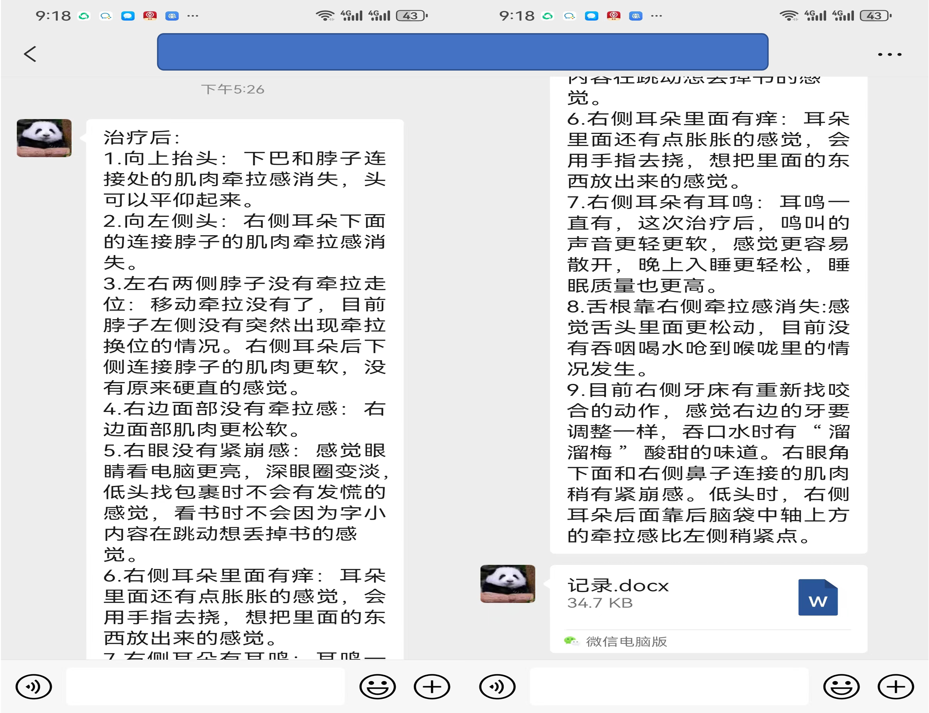 回家后视物清晰,黑眼圈变淡,低头找包裹时不会有心慌感觉,看书不会因为字小、内容在跳动想丟掉书的感觉。右侧耳内发痒微胀,欲挠之放出里面东西而后快。耳鸣声音更轻、更软、更易散开。舌根右侧牵扯感消失,舌根更松软,饮水呛咳消失。右侧牙咬合对位更佳。口内津液酸甜感。睡眠质量更高。右侧眼下鼻外稍有紧绷感,低头右侧枕部较左侧略紧张。