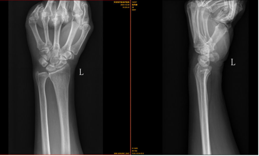 【影像】左侧腕关节正侧位片报左腕尺骨变异征阳性(关节面尺侧高于桡侧)。