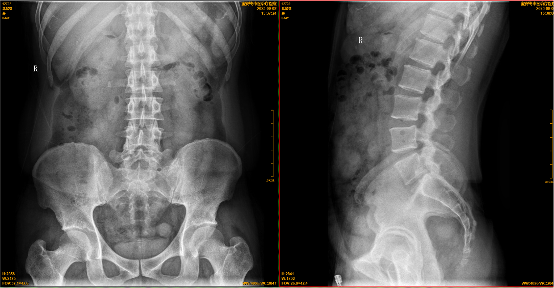 【影像】20230902我院X线见:腰椎轴线轻度侧弯、旋转,生理曲度存在;各腰椎椎体骨质完整,第4~5腰椎椎体前缘上下角轻度骨质增生、变尖,边缘硬化;各腰椎椎间隙未见变窄;第5腰椎左侧横突肥大,并与骶髂骨形成假关节。