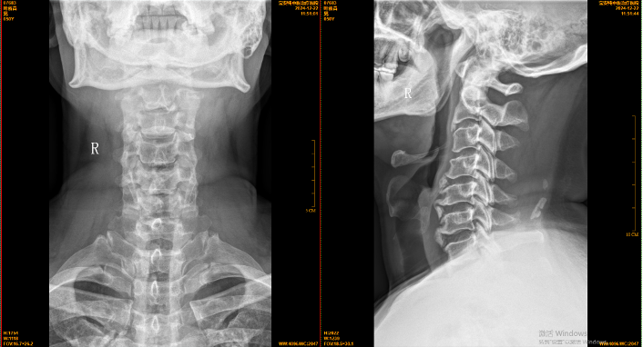 【影像】20250117颈椎X线片报寰齿间距略失对称,颈椎退行性变,C4椎体稍后移。阅片见颈椎上段平直,C4-5失稳,C2-3、C5-6前缘增生,项韧带钙化,右侧寰枢外侧关节对合不全,枢椎棘突略偏左。