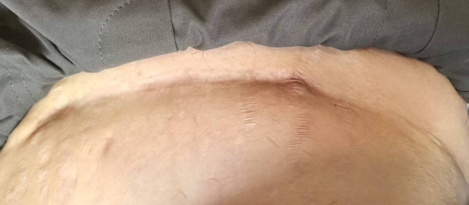 【讨论】腰部疼痛,查体腰部未触及明显肌紧张及痛点,考虑非腰源性腰痛。腰椎反弓状态,考虑为腹源性腰痛,其痛在弓背,伤在弓弦,腹直肌损伤最为常见。隔衣触诊腹直肌部未发现肌紧张及痛点,排除腹直肌损伤。暴露腹部见下腹横切弧形剖腹产瘢痕,右侧端瘢痕粗大、色红。触诊深层触及花生粒大小结节,压痛(+),按压结节患者自觉腰部轻松,伸直双下肢腰部无疼痛,诊断为瘢痕源性腰痛。