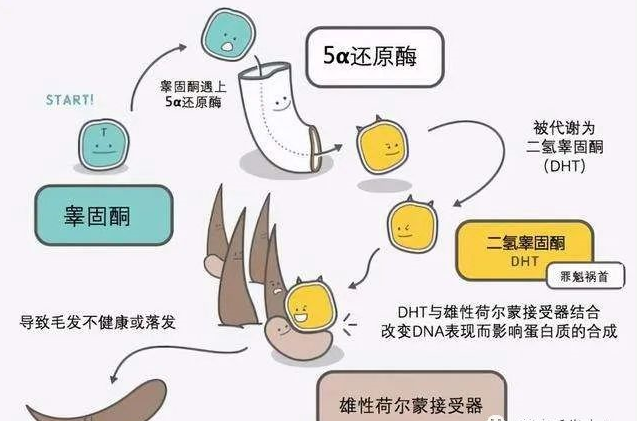 “雄脱”的核心原因是:雄性激素双氢睾酮(DHT)对遗传易感性头皮毛囊(含有5-a还原酶)产生影响,加速毛囊萎缩,直至完全闭合,从而导致不可逆的脱发。DHT由睾固酮与还原酶结合后生成。对DHT敏感的毛囊主要分布于前额、头顶和顶部。“雄脱”的人后枕的毛囊不受DHT影响,除了意外损伤和到年龄生理脱发外,这两处的头发一般不会掉。