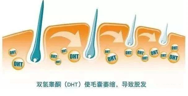 在头顶,二氢睾酮与雄性激素受体结合,并作用于毛囊,使毛囊萎缩变小,提前进入休止期,毛囊的生长周期越来越短,长出来的头发也越来越细软,终会脱落。