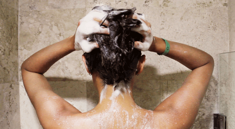 其次用流动水将头发浸湿,将洗发水先倒在手上,搓出泡沫后涂抹在头皮和头发上。
