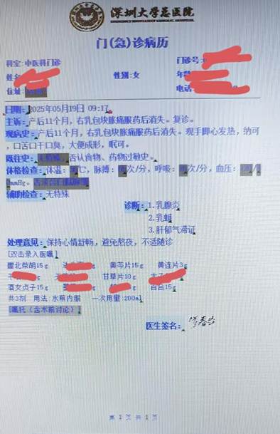 2025年5月的一天,35岁的王女士因“产后11个月,右乳包块胀痛1天”就诊于深圳大学总医院中医科门诊。第一次就诊时,她主诉在哺乳期,乳房胀痛、可触及鸡蛋大小包块,手脚心发热、口臭、烦躁易怒、大便不成形,睡眠不足,中医诊断为乳痈(肝郁气滞证),西医诊断产后乳腺炎,开具了清热解毒散结、疏肝理气解郁的中药方剂。服药3剂患者乳房包块已完全消失,但仍有口苦口干、手脚发热等症状,中药处方随之调整,并建议“保持心情舒畅,避免熬夜”。