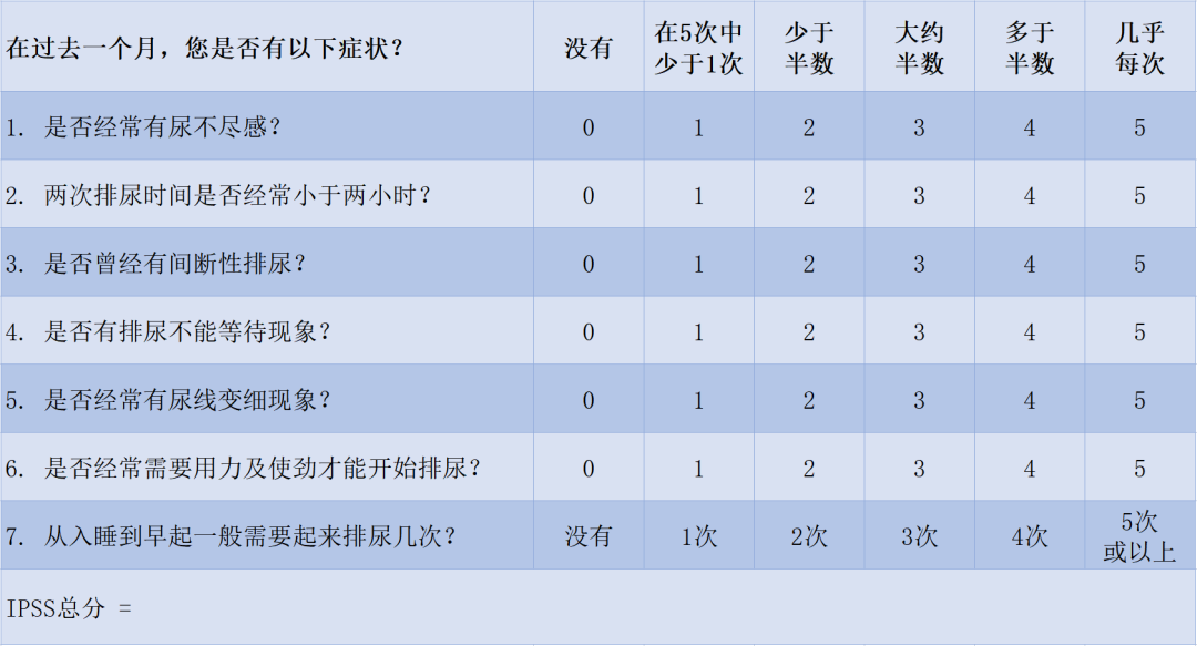 增生初期,患者多表现为夜间被尿意唤醒,起夜次数增加;渐渐地,白天也会频繁排尿,但每次尿量不多;随着增生逐渐增大排尿阻力,患者开始尿流缓慢、排尿无力、尿线射不远,总有一种“尿未排尽”感觉。如未及时诊治,可发展为膀胱内尿液无法完全排解,出现反复尿路感染、膀胱结石,严重时可导致双侧肾积水、尿毒症。 前列腺增生的体积,与排尿症状的严重程度不成正比。有些年轻患者的前列腺体积不大,但形状特殊,堵塞了尿道,需立即手术;有些年长者的前列腺体积大,但尿道堵塞不严重,排尿没有异常或症状很轻。 评判自身前列腺增生是否严重,可对照“国际前列腺症状评分”进行打分,总分0~7为轻度,8~19为中度,20~35为重度。 症状很轻的患者,只需养成良好生活习惯,比如戒酒、适当饮水、清淡饮食、避免久坐;若症状改善不明显,可先接受药物治疗,帮前列腺“减肥”。 目前,临床有缩小前列腺体积的药物,适用于超过40毫升的大体积前列腺;有针对前列腺张力的药物,往往症状改善明显,但无法阻挡前列腺持续增大的趋势,还有些药物可改善膀胱功能及前列腺内局部微环境。 如果服药期间症状无改善或逐渐加重,甚至出现严重尿频、尿急等情况,可考虑手术摘除增生的部分前列腺,彻底解决前列腺增生造成的排尿阻力。