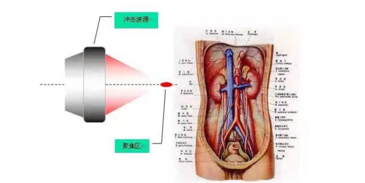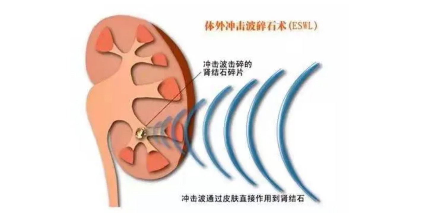 所谓体外冲击波碎石术,其英文简称为“ESWL”,具体是指医生操控体外碎石机产生冲击波,待机器聚焦后,将其对准患者体内的结石,经过多次释放能量而击碎结石,使之随着尿液排出体外。