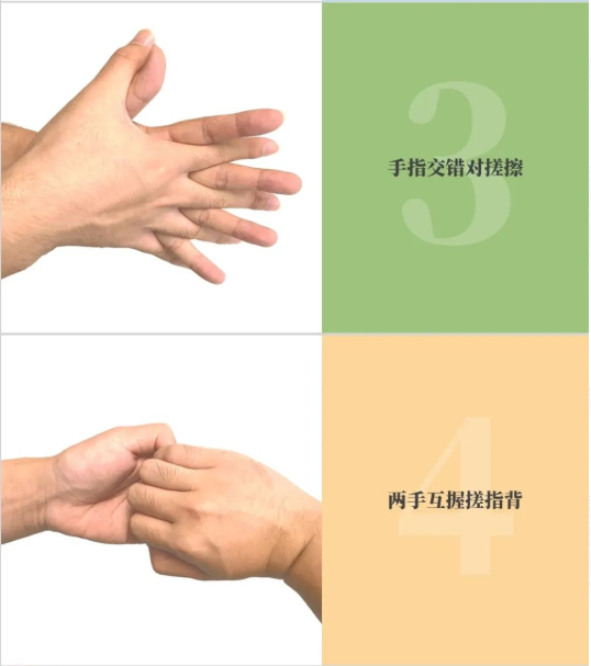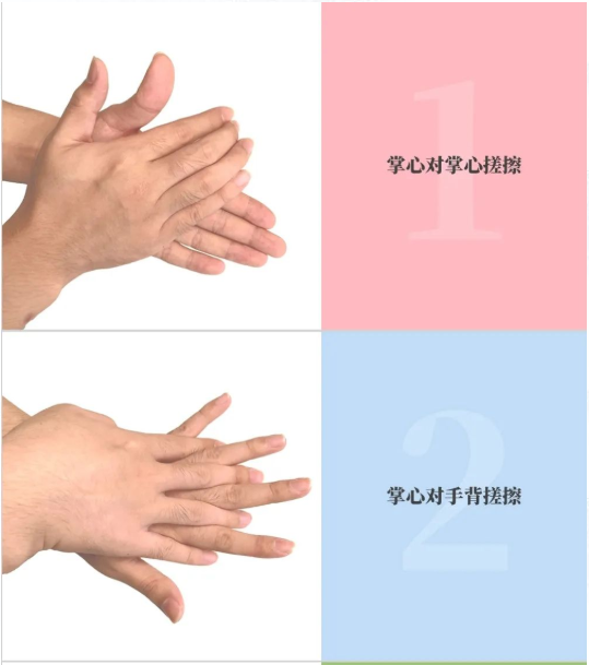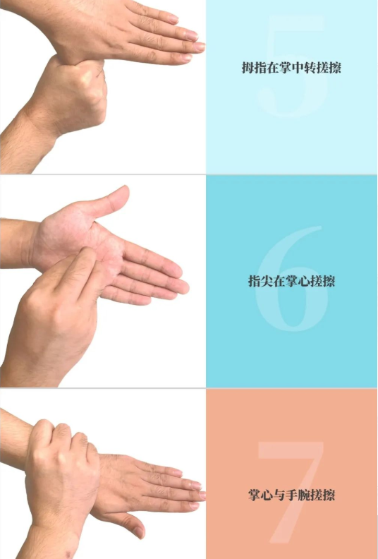 “七步洗手法”▼(口诀:“内、外、夹、攻、大、立、腕”。)