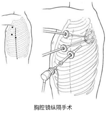 纵隔肿瘤一经发现,一般都需手术治疗。传统开胸手术,需要锯开胸骨或是咬断肋骨,创伤大、疼痛重、恢复慢。术后并发症多,而长长的切口也给患者的胸部留下了难看的疤痕。最近几年普遍开展的微创胸腔镜手术极大的改进了手术。