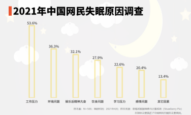 从2021年中国网民失眠原因调查来看,53.6%网民因工作压力而失眠;而环境问题、娱乐后精神亢奋也是导致许多人失眠的重要原因,占比分别为36.3%、32.1%;此外,也有部分网民因为饮食问题、学习压力和情感问题等而失眠。