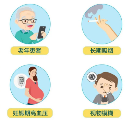 老年高血压患者、长期吸烟的人群、妊娠期高血压的孕妇等,应该特别警惕高血压引起的眼底问题。所有的高血压患者,出现视物模糊的情况时,也应该及时做眼底检查