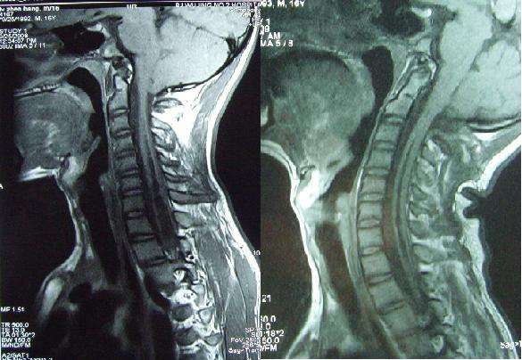 病例一:张某,男,16岁,枕部疼痛,双侧上肢麻木2年,双上肢无力,肌肉萎缩1年。