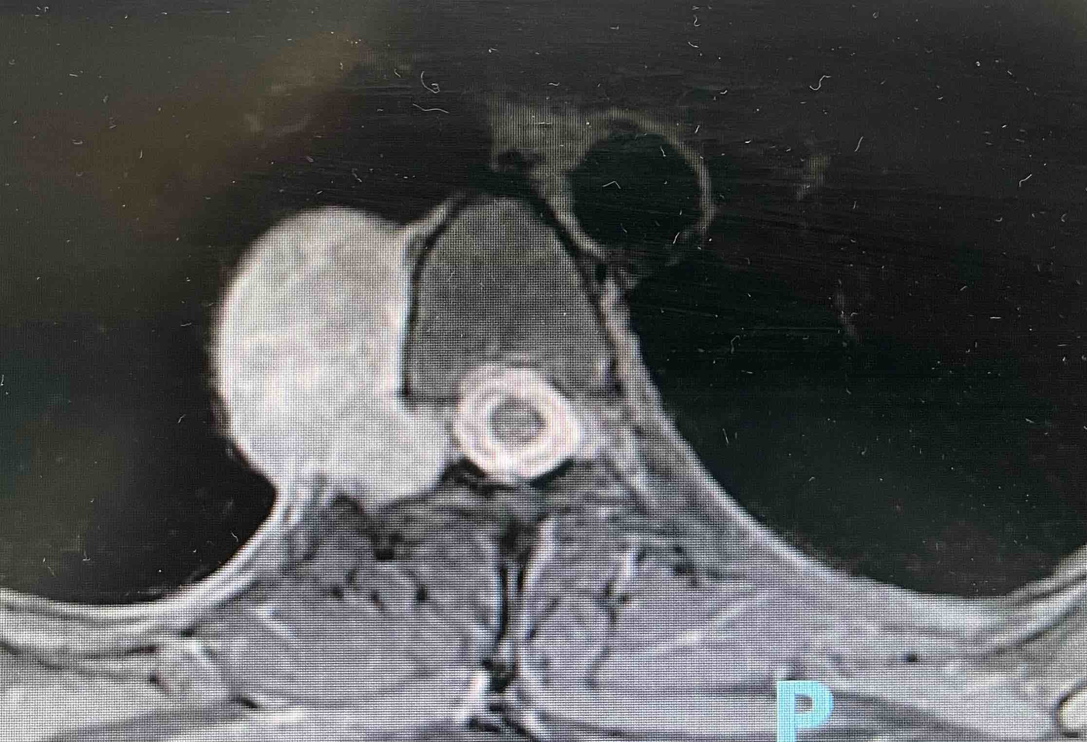 神经鞘瘤是起源于神经鞘雪旺细胞的一种良性肿瘤,常与神经根相连,可发生囊性变、坏死与出血,在椎管或椎体呈哑铃状。亦可发生于交感神经、迷走神经和喉返神经,肿物多有完整包膜,多为不规则分叶状和卵圆形,少数呈球形,表面光滑,目前病因尚不完全明了。