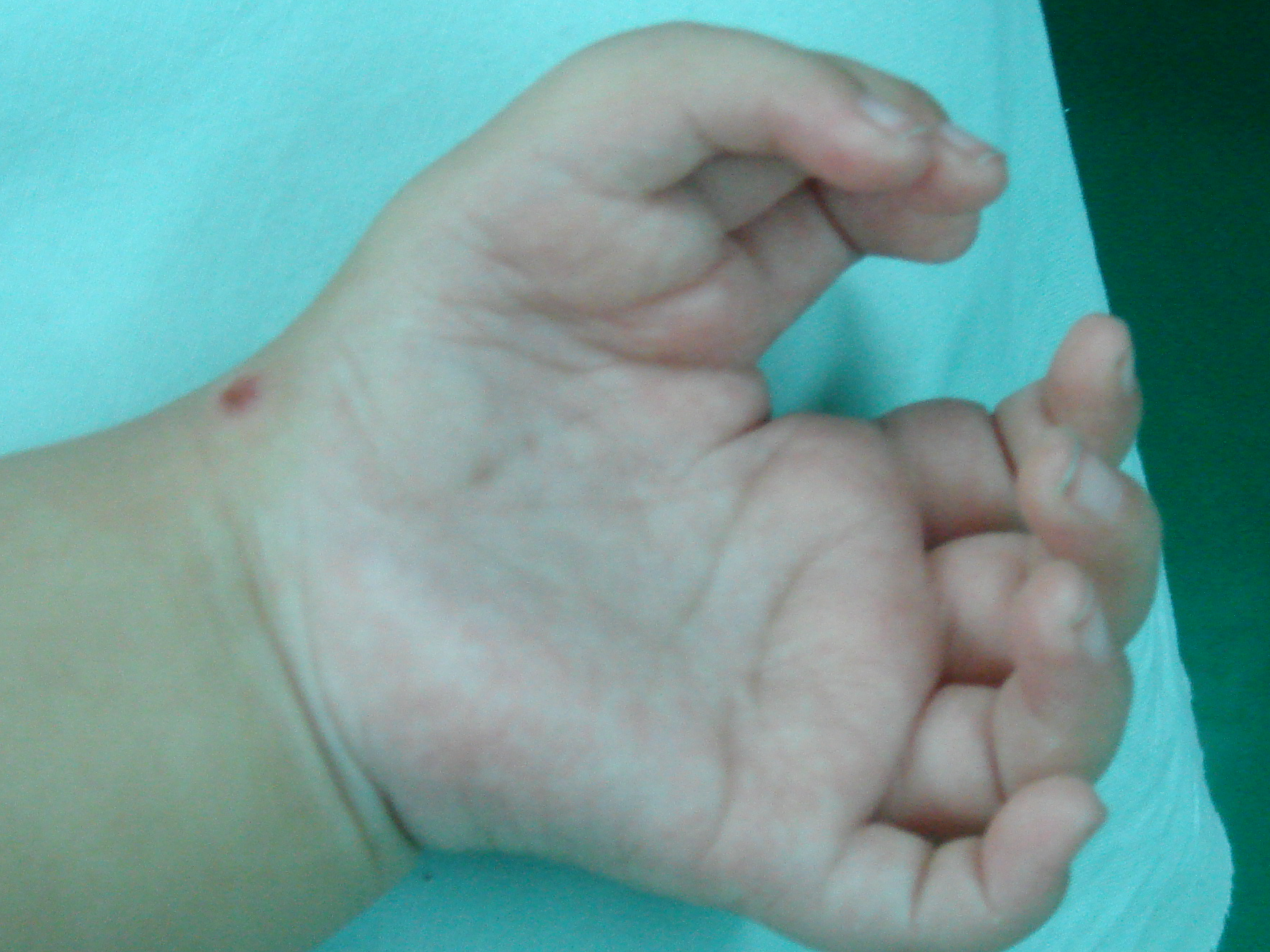 症状为赘生指,畸形种类很多。男孩发病率高于女孩,男:女5:1,单手多与双手,右侧多于左侧,其中拇指多指畸形发病率占总数的90%以上。