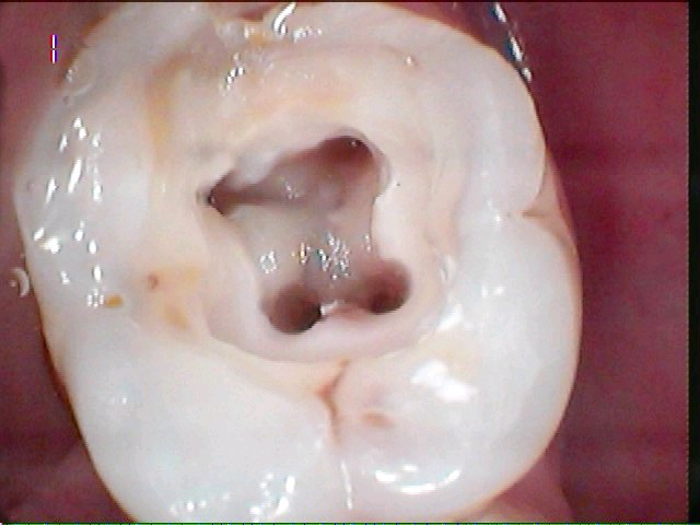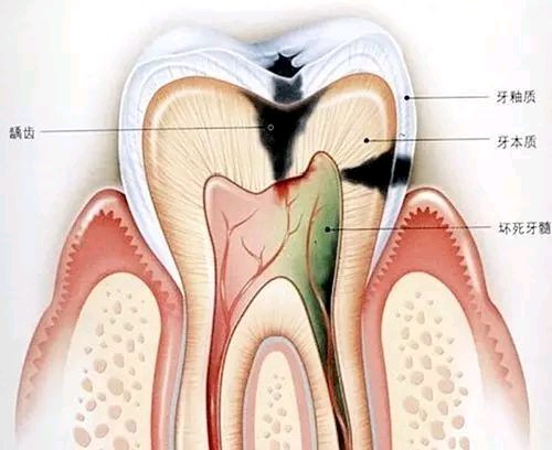 如果龋坏达到牙髓就需要做根管治疗。(牙髓包含了动脉、静脉、淋巴管、神经等其他组织细胞)。下图坏死牙髓。