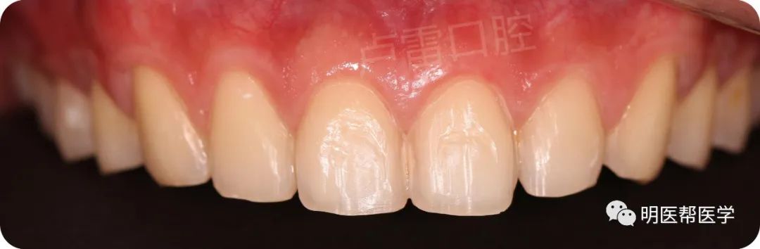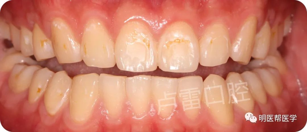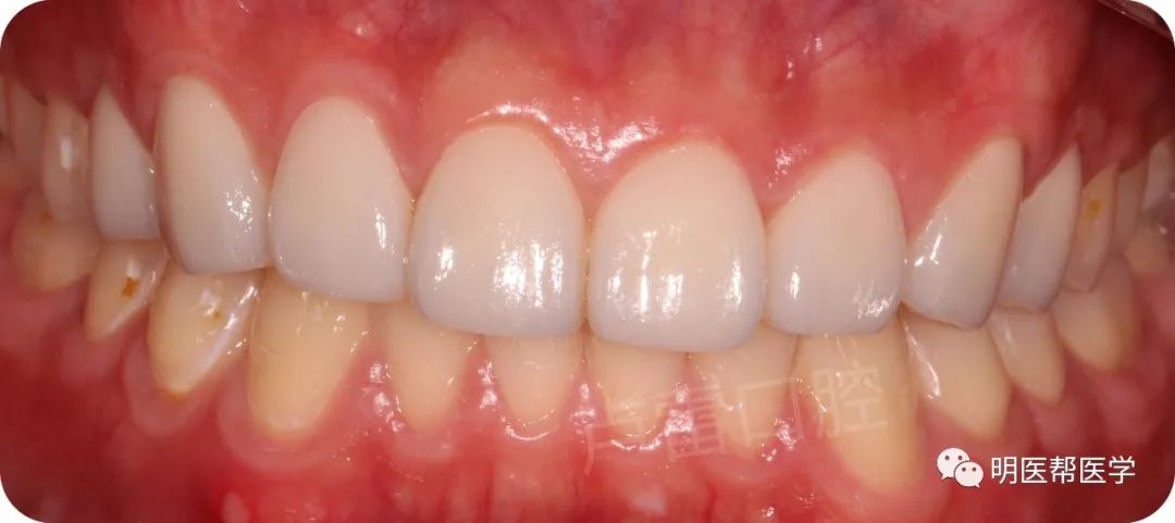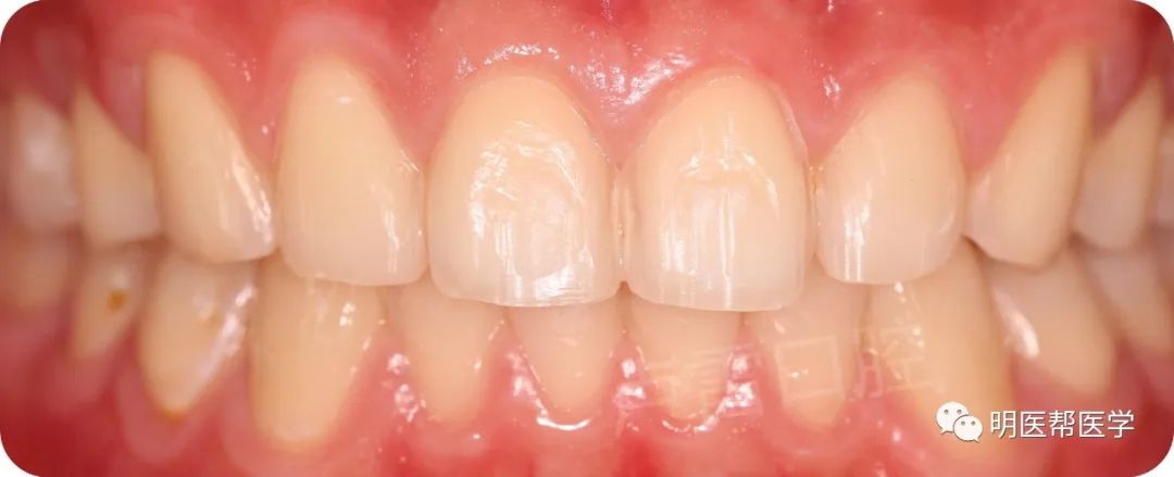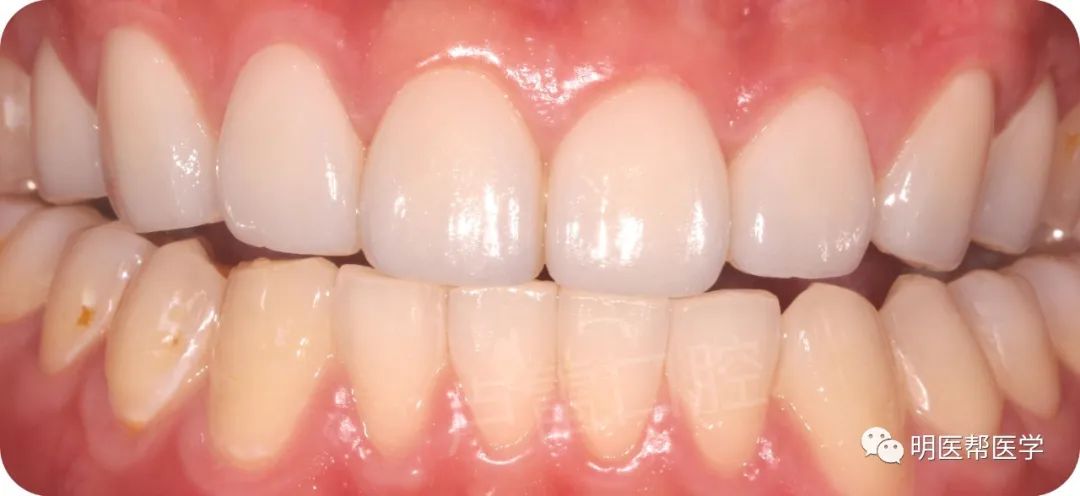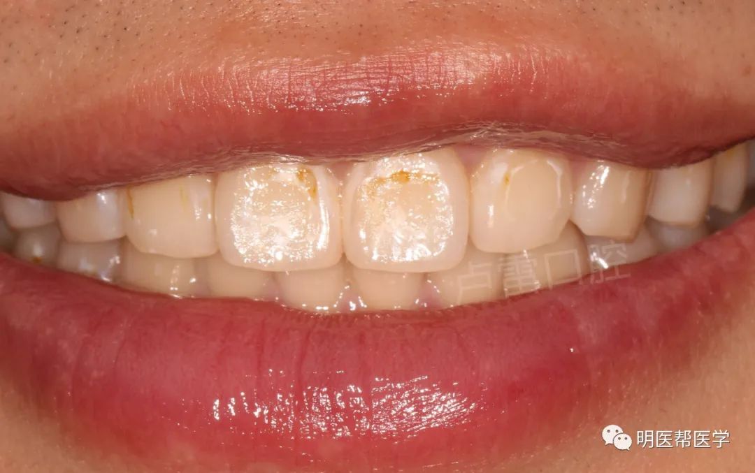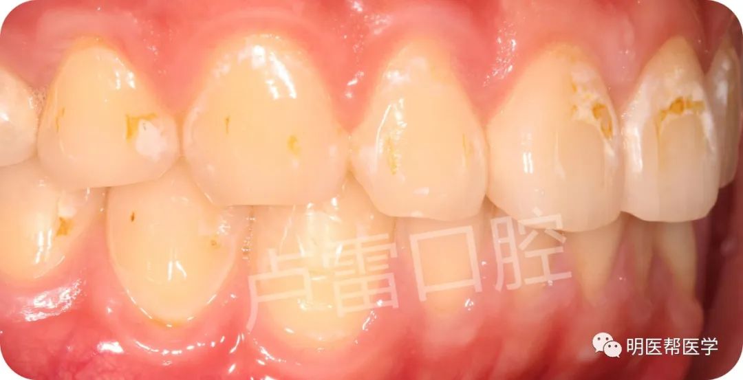 矫正治疗后牙面有黄色斑点状脱矿现象,影响美观。采用 微创数字化全瓷贴面修复上颌牙 术前、术中、术后对比。